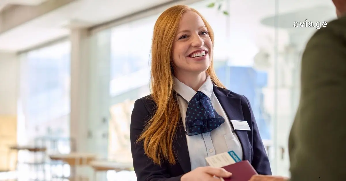 ღიმილიანი ბორტგამცილებელი ფორმაში, რომელიც მგზავრს პასპორტსა და ბორტინგ ბარათს ართმევს